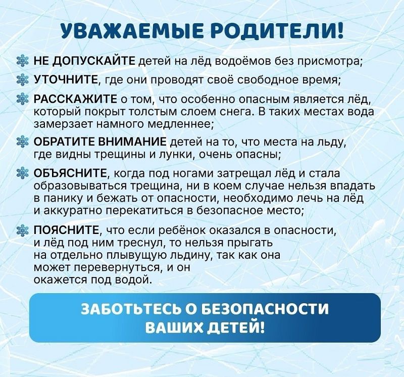 В связи с наступлением зимнего периода, с целью предупреждения травмирования и гибели несовершеннолетних, информируем вас о недопустимости нахождения несовершеннолетних вблизи водоемов с неокрепшим льдом, выхода на лед, катания на санках, коньках, ледянках вблизи автодорог, деревьев, водоемов; об угрозах травмирования от падающих сосулек, масс снега с крыш.