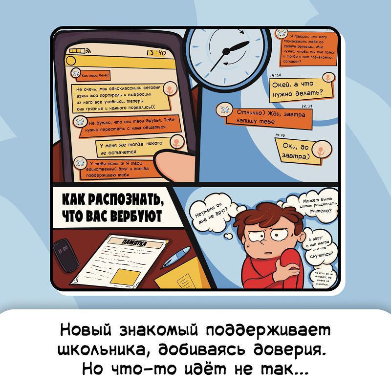 Школьники с 1 по 11 класс и учащиеся СПО познакомились с важнейшими правилами безопасного поведения в Интернете. Что нужно помнить каждому, чтобы общение в Сети было безопасным — рассказали в карточках.