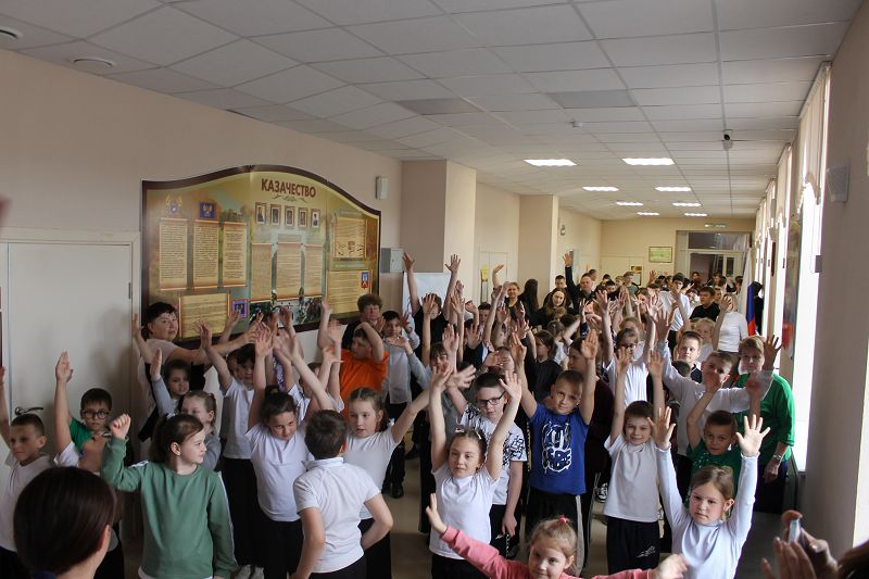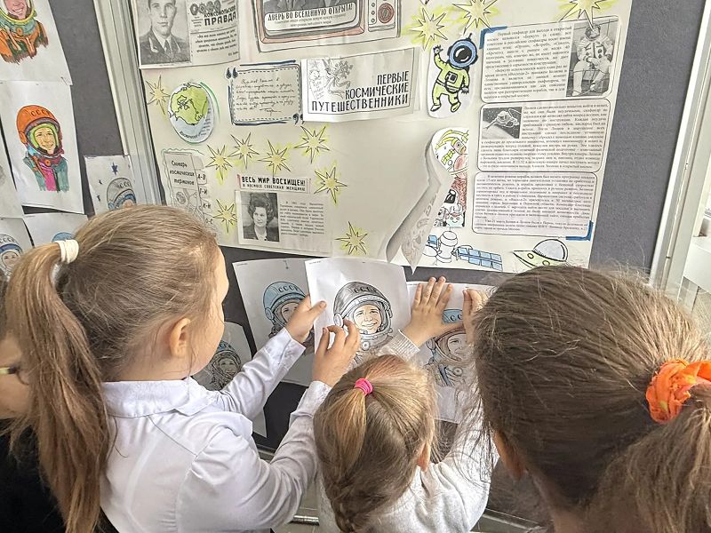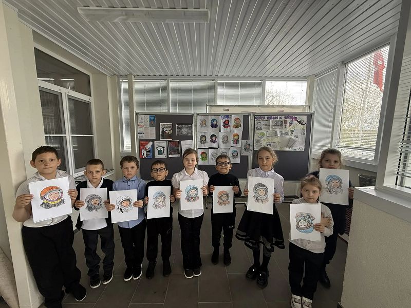 В классах и фойе была оформлена выставка детских рисунков и стенгазет «Этот загадочный космос». Были организована «Космическая зарядка» и кинолекторий «Он был первым!»