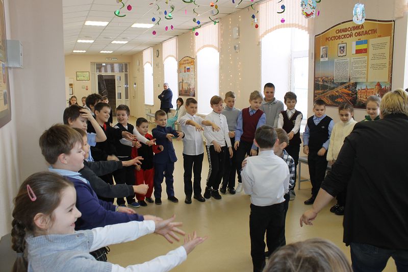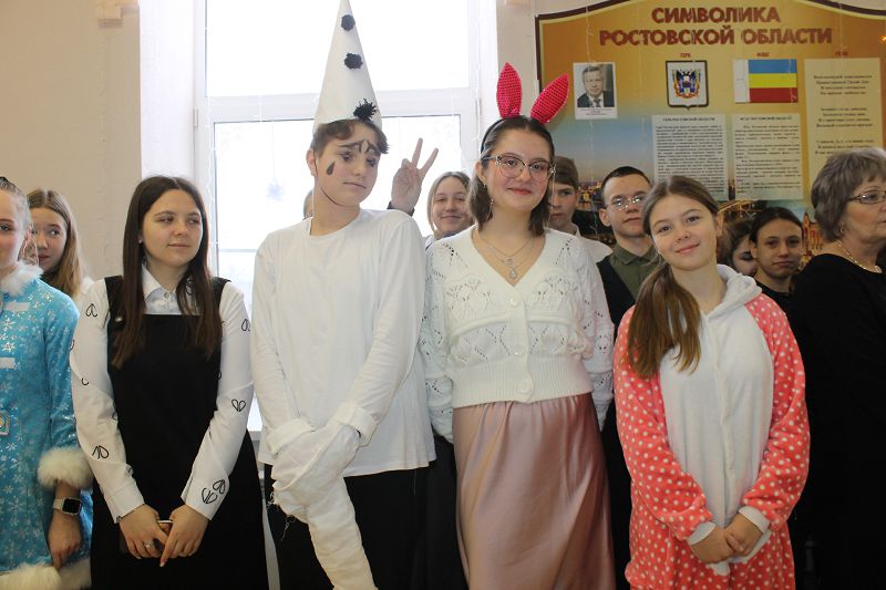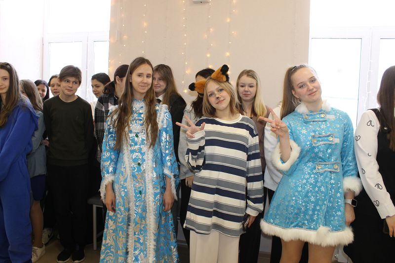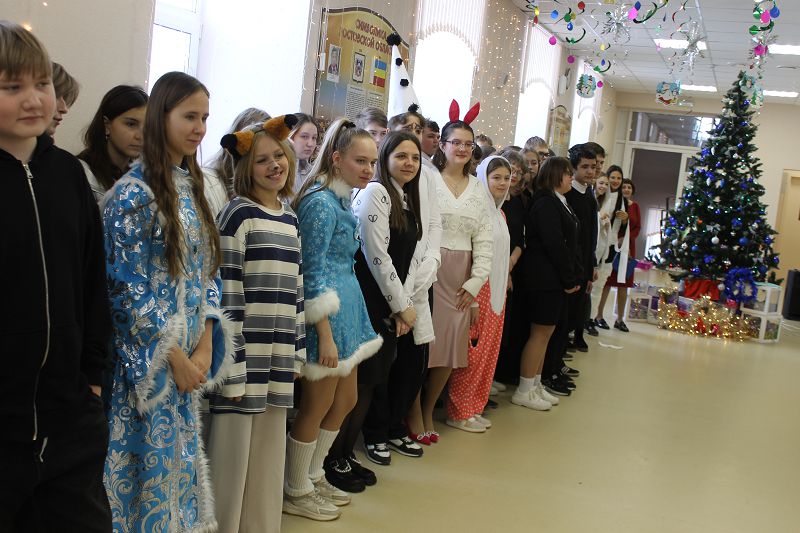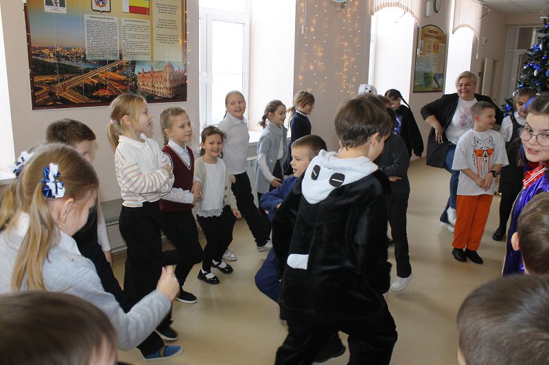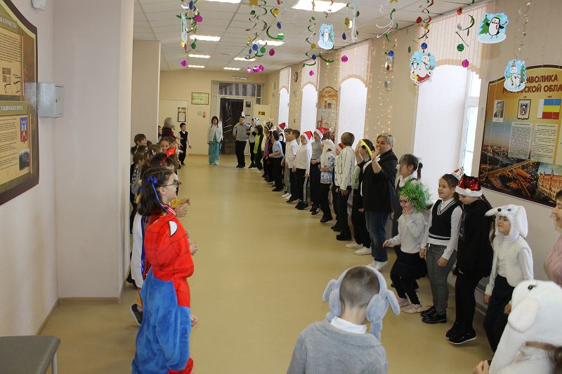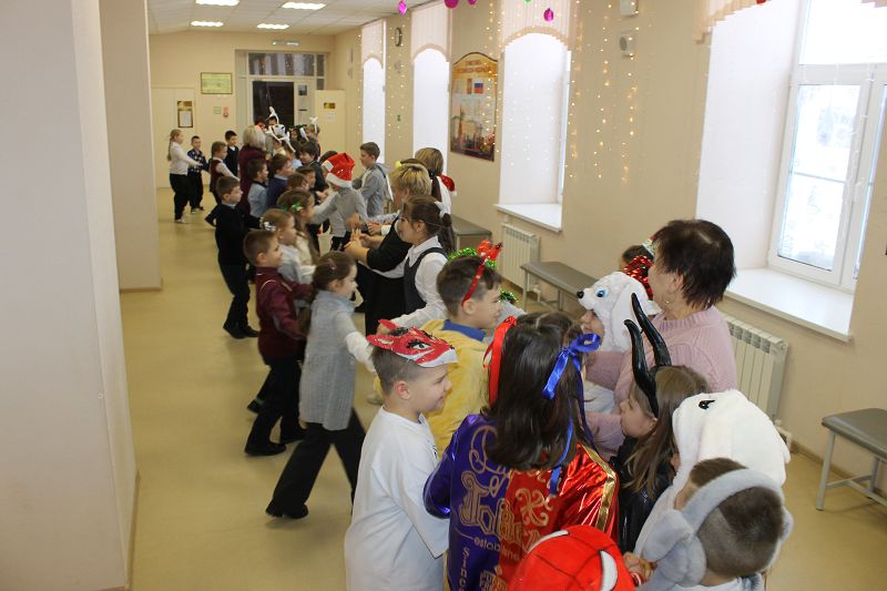 Сегодня дети пришли в образах героев из своих любимых мультфильмов и фильмов. На переменах для них были организованы новогодние игры и традиционный хоровод возле елки.