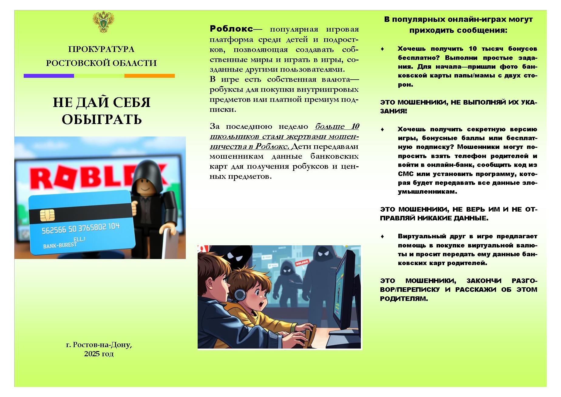 Уважаемые родители! За последнее время участились случаи мошенничества в отношении детей с использованием онлайн-игр (Роблокс, Страж королевства и др.). Мошенники, используя виртуальные аккаунты, пишут детям сообщения с предложениями получить бесплатные бонусы и дополнительные ценные предметы на игровой платформе. Для реализации предложений просят несовершеннолетних направить фото банковских карт родителей, прислать код из сообщения ,угрожают детям.