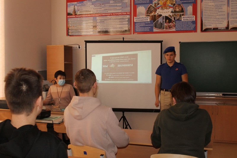 Сегодня, 14 февраля, в 10 классе проведен классный час, посвященный освобождению г.Ростова-на-Дону от фашистских захватчиков. Ученики совершили виртуальную экскурсию по памятным местам города, почтили память о погибших защитниках и жителях города минутой молчания.