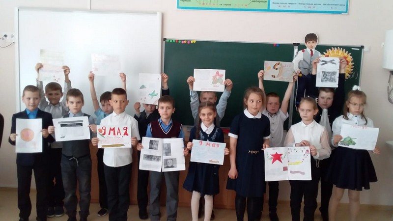 4 мая для начальной школы состоялся конкурс рисунков «Рисуем Победу». Ребята изобразили на своих рисунках поздравления и события, рассказывающие о жизни, судьбе родных и близких в годы войны. Лучшие работы примут участие в школьной экспозиции, посвященной землякам-героям ВОВ.