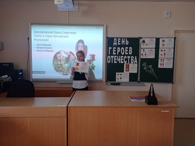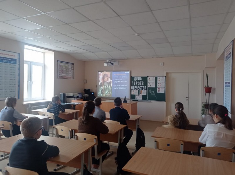 Посмотрели фильм о детях-героях, которые были удостоены высшей государственной награды. Послушали доклады одноклассников о полных кавалерах ордена Святого Георгия, ордена Славы, Героях Советского союза и Российской Федерации.