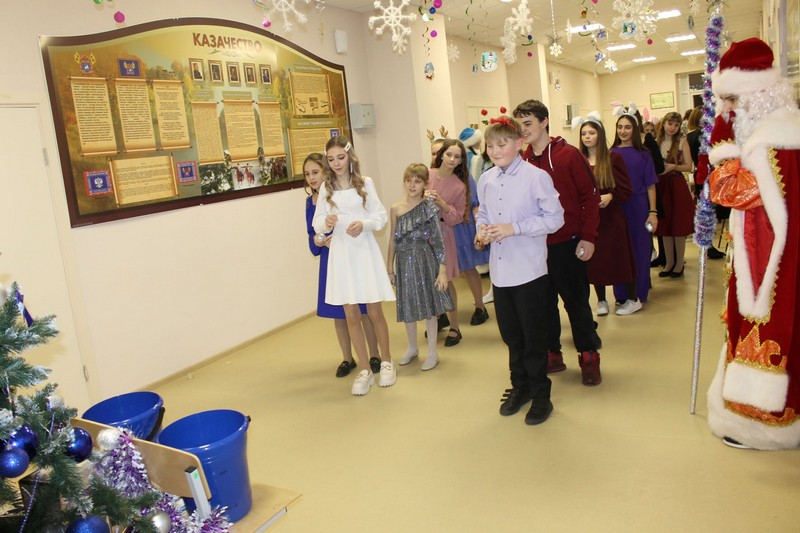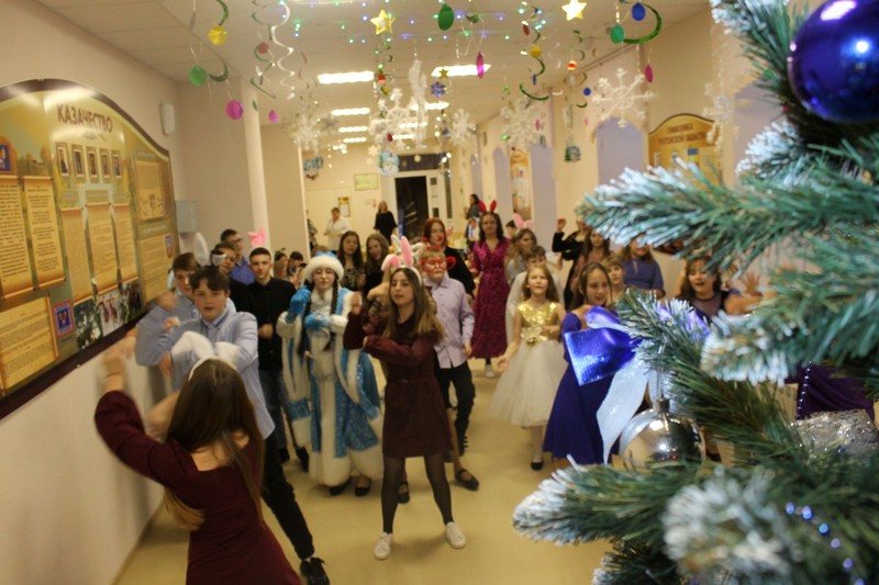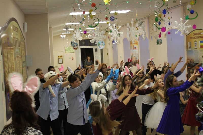 С появлением Деда Мороза и Снегурочки начался настоящий праздник с песнями и танцами, хороводами вокруг ёлки. Пятиклассники спели песню-символ этого праздника «Jingle Bells». Зайцы-бандиты из 6 класса покупали елку за «капусту», а семиклассники закружили всех в ярком новогоднем флэш-мобе. Дети зарядились праздничным настроением и ощущением волшебства.