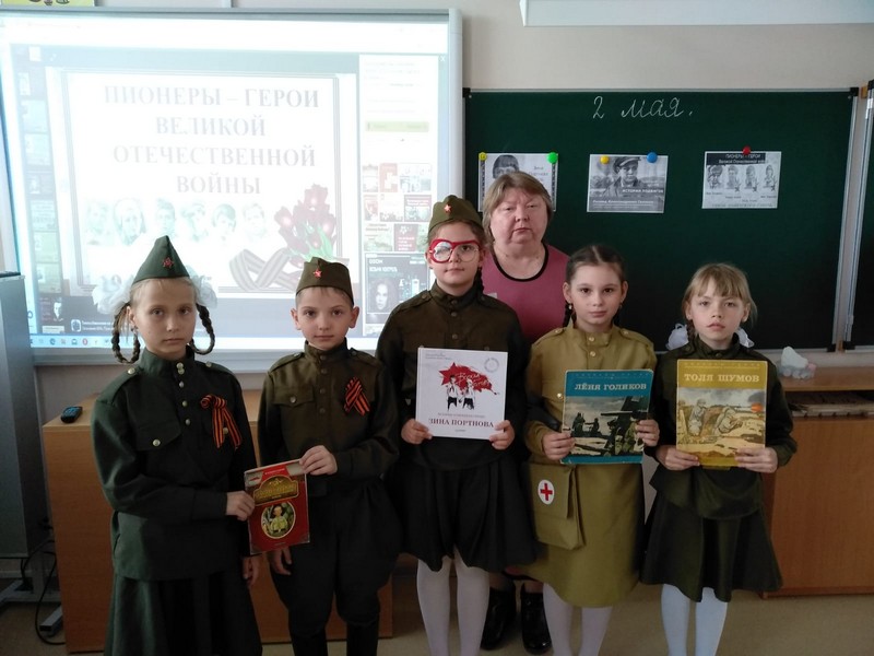 В начальной школе библиотекарь Углегорской межпоселенческой библиотеки Громакова Светлана провела библиотечный час «Пионеры- герои Великой Отечественной войны». Дети познакомились с такими героями как Марат Казей, Зина Портнова, Леня Голиков.
