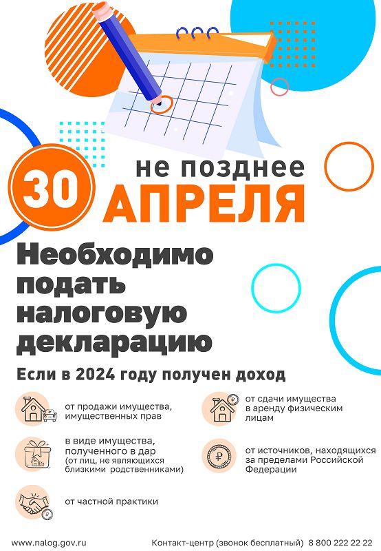 Уважаемые налогоплательщики! О доходах, полученных физическими лицами в 2024 году, необходимо отчитаться не позднее 30 апреля 2025 года.