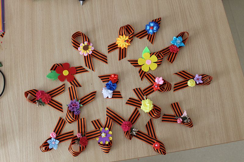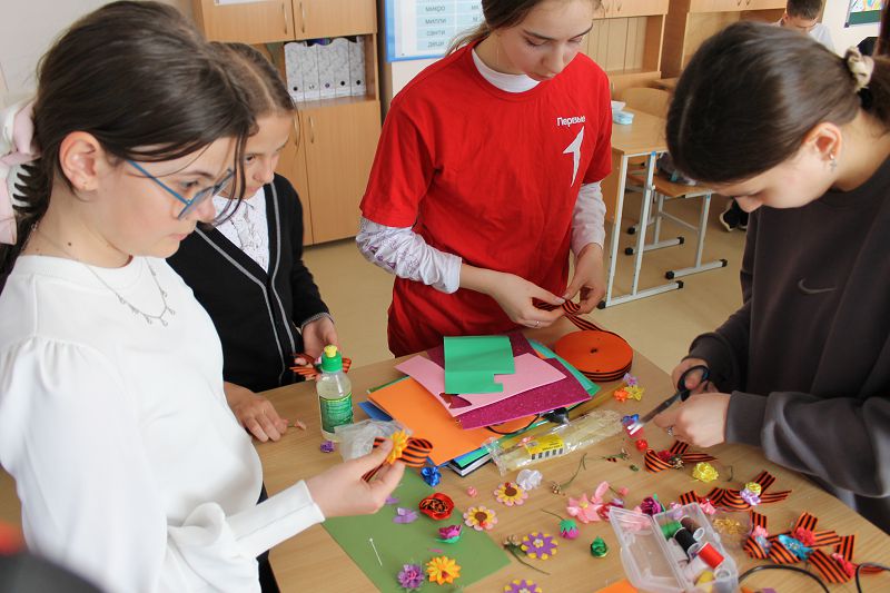 В преддверии 9 Мая в Углегорской школе был проведен мастер-класс в рамках акции «Артисты фронтовых бригад». Калюжная Вероника вместе с обучающимися школы своими руками создавали георгиевские ленточки ,а после вместе с участниками Движения Первых подарили их жителям поселка и людям социально важных профессий.