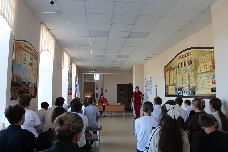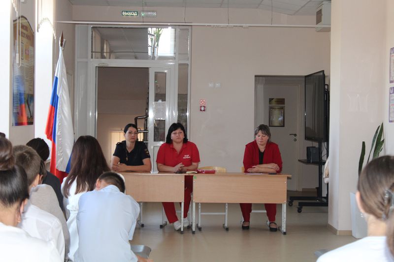 С обучающимися 8-9 классов встретились инспектор ПДН ОУУП и ПДН ОМВД России по Тацинскому району младший лейтенант Боброва Елена Михайловна, ответственный секретарь КДН и ЗП Администрации Тацинского района Феськовец Светлана Александровна и Председатель местного отделения «Движения Первых» Наумик Светлана Александровна.