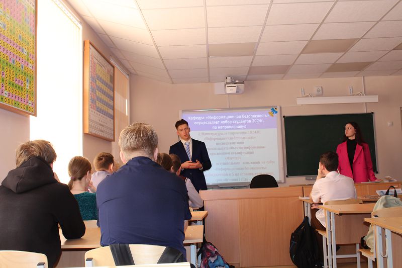 Сегодня в Углегорской школе состоялась встреча обучающихся 10-11 классов, со студентами НПИ им. Платова. Кирилл и Анастасия обучаются в институте (5 и 1 курсы соответственно), являются активными участниками различных конкурсов, мероприятий, проводимых кафедрой информационной безопасности, студентами которой они являются.